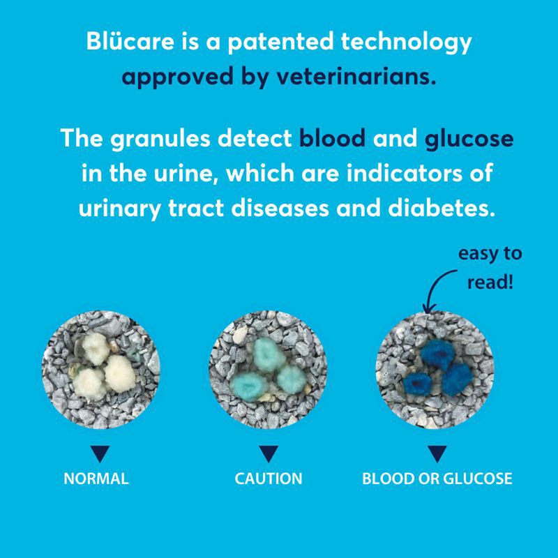 Certain health conditions in cats, such as urinary tract infections and diabetes, can be identified through specific changes in their urine. ODOURLOCK MaxCare Cat Litter offers advanced protection with its patented "blücare" technology, which detects these changes by discolouring shortly after absorbing liquid.